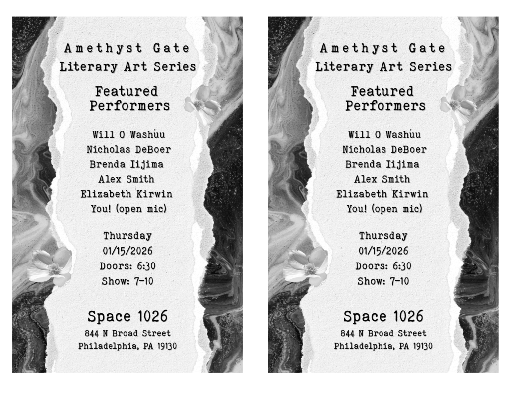 Amethyst Gate returns with an evening of live performance featuring Will O Washuu, Nicholas DeBoer, Brenda Iijima, Alex Smith, and Elizabeth Kirwin. Plus — an open mic for anyone who wants to join in. Performances can be spoken, sounded, read, improvised, or hard to define. If you’ve been looking for a low-pressure place to try something out, this is it. 🔮 Next Amethyst Gate — Thursday, January 15, 2025 Doors 6:30 · Performances 7–10 PM 📍 Space 1026 · Philadelphia 🕯 Free + open to all 🔗 More info & details: amethystgate.com